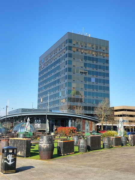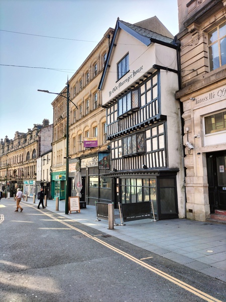 Contrasting styles - the Tudor Ye Olde Muringer House (pub) in the High Street and Clarence House (modern monstrosity) which was the destination of our vist